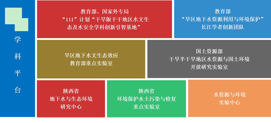 干旱半干旱地区水文生态及水安全学科创新引智基地”,拥有旱区地下水文与生态效应教育部重点实验室、国土资源部干旱半干旱地区水资源与国土环境开放研究实验室、陕西省地下水与生态环境工程中心等省部级重点实验室。此外,还建成了多功能降雨大厅、水力学实验室、水资源与环境实验中心三大实验基地,水与环境原位试验场、鄂尔多斯水盐运移原位试验场两大实训基地,汉中梁山地质教学实习基地、陕西蓝田专业教学实习基地、鄂尔多斯野外实习基地三大校外实习基地,在中国地质调查局西安地调中心、中煤科工集团西安研究院、西安水务集团、泾惠渠灌区管理局、青海省环境地质勘查局、甘肃地质环境监测院、宁夏地质环境监测院等9个“产学研三结合”基地,建成了1个大学生创新实验区和一个水资源系统仿真模拟实验室。