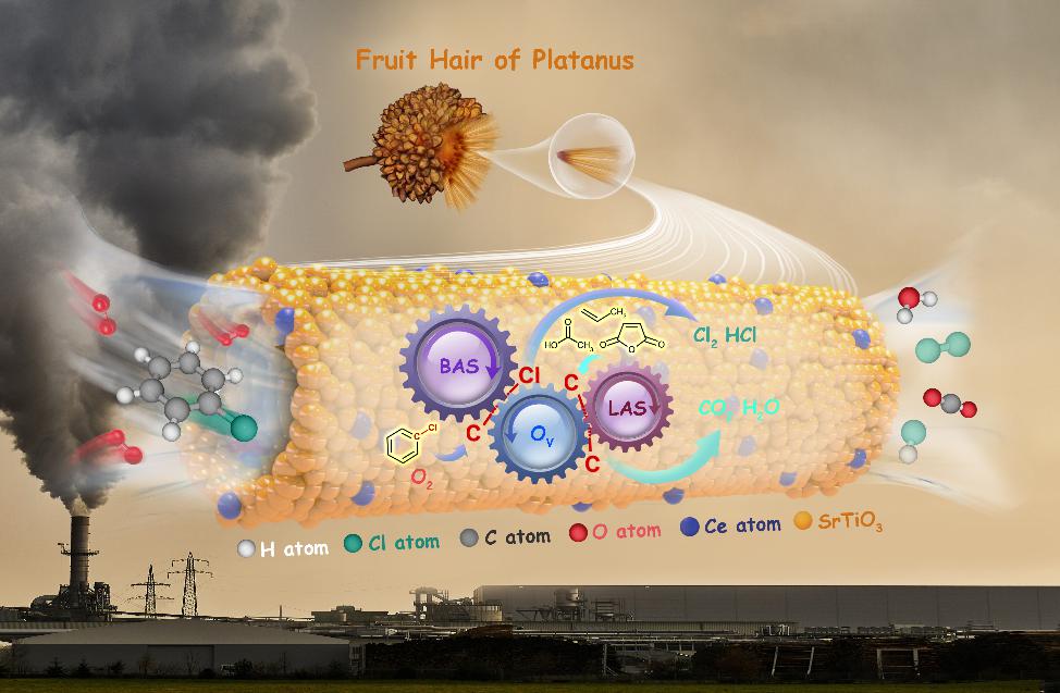 含氯挥发性有机化合物(Cl-VOCs)的环境持久性和高毒性使其成为难降解有机化合物之一。催化技术因具有多组分普适性,高矿化率等优点在Cl-VOCs的降解上被寄予厚望。尽管在这一领域研究人员已经做出了巨大努力,但由于含氯物质的腐蚀、氯中毒和工业排放中组分复杂的影响,所开发的催化剂仍然存在反应活性和稳定性低的问题。基于此,该研究以悬铃木果毛为生物模板,设计合成了中空管状结构的CexSr1-xTiO3催化剂用于降解氯苯,通过实验表征,特别是原位表征技术结合理论计算,深入剖析活性氧、路易斯酸位点(LAS)和布朗斯特酸位点(BAS)的协同作用。提出生物模板引入了大量的氧空位,高浓度的氧空位和BAS促进CB的C-Cl键断裂并加速Cl自由基解吸成无机氯,从而避免了氯中毒。同时,Ti-Ce-Sr键的形成增加了LAS的酸性,增强了复合催化剂的还原性,促进了脱氯中间体的深度氧化,提高了C-C键活性促使其在低温断裂(图2)。本研究使用了绿色植物废弃物-悬铃木果毛作为中空生物模板,不仅提高了催化剂活性,而且为这种固体废物的利用提供了新思路,达到“以废治废”的目的。