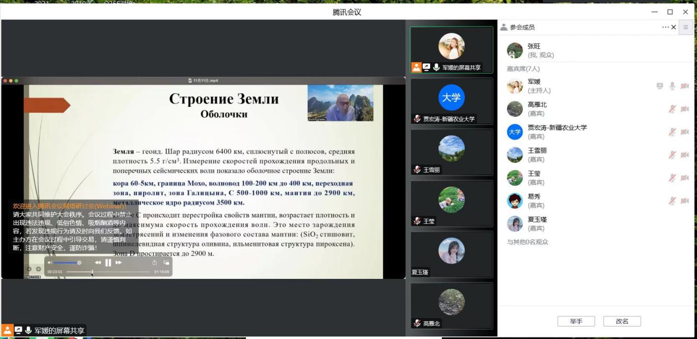 Б.Н.雷仁科教授在讲座中系统的讲述了普通地球化学的学术概念,有趣生动的为大家讲述了宇宙和地球的化学元素起源,及其在大气圈、水文圈、岩石圈的分布特性和规律;形成过程中发生的主要的化学反应和典型的晶体同构现象等。Б.Н.雷仁科教授通过例举科学家们的学习和工作方法,教育同学们要有严谨的科学钻研的态度,同时要博闻强识,勇于探索未知;并祝大家学业所成!