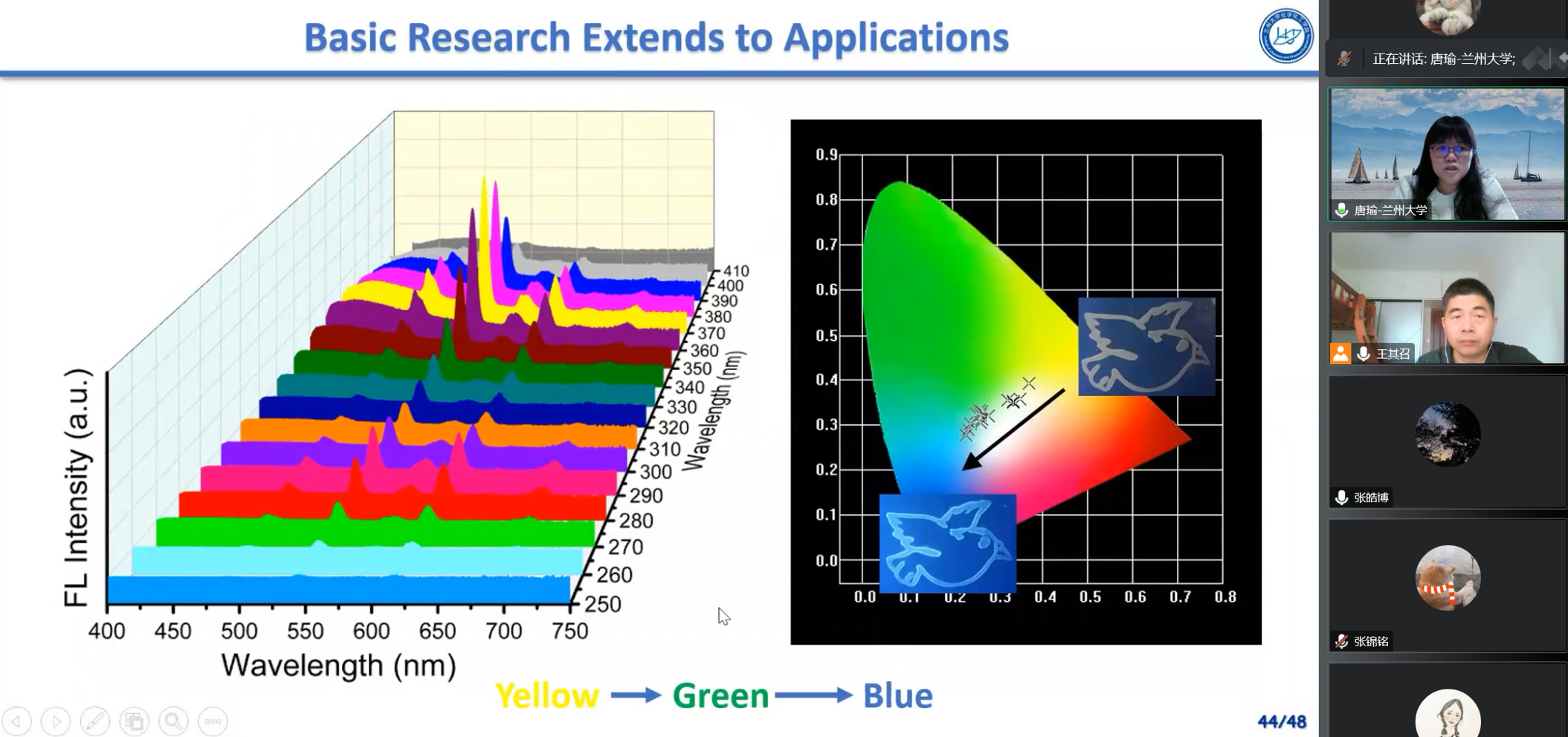唐瑜教授介绍了她们课题组近年来在分子水平精准调控稀土配合物发光性能方面的研究进展,着重介绍了其团队通过界面效应、原位配位、能量转移与传递等策略,设计、合成具有特定结构与功能的有机配体,实现了稀土配合物的荧光光谱及寿命调制,并据此在多功能生物成像探针、多维度信息编码与存储、能源等领域做了一系列创新性工作,取得的研究成果对稀土功能配合物研究和稀土资源的高值化利用具有重要理论意义和应用价值。
