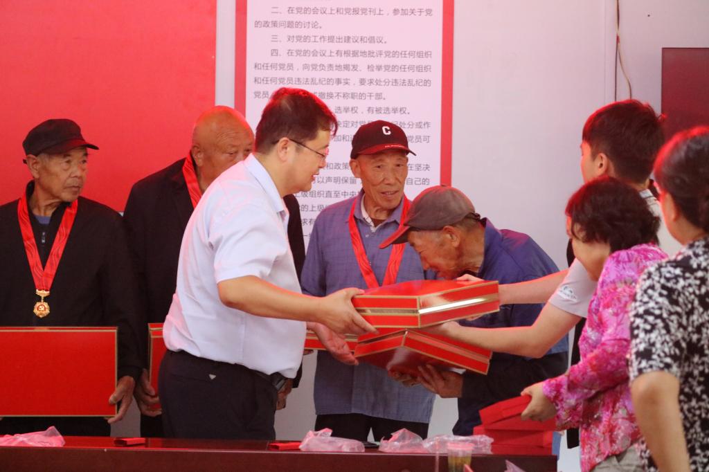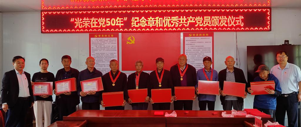 活动第一环节,举行“光荣在党50年”纪念章颁发仪式。张骞文和张瑞分别为村里10名荣获奖章的老党员逐一佩戴纪念章、发放纪念品,并向荣获奖章的老党员表示热烈的祝贺和崇高的敬意。之后,在张骞文的带领下,全体参会党员面对鲜红党旗,庄严宣誓,重温入党誓词。