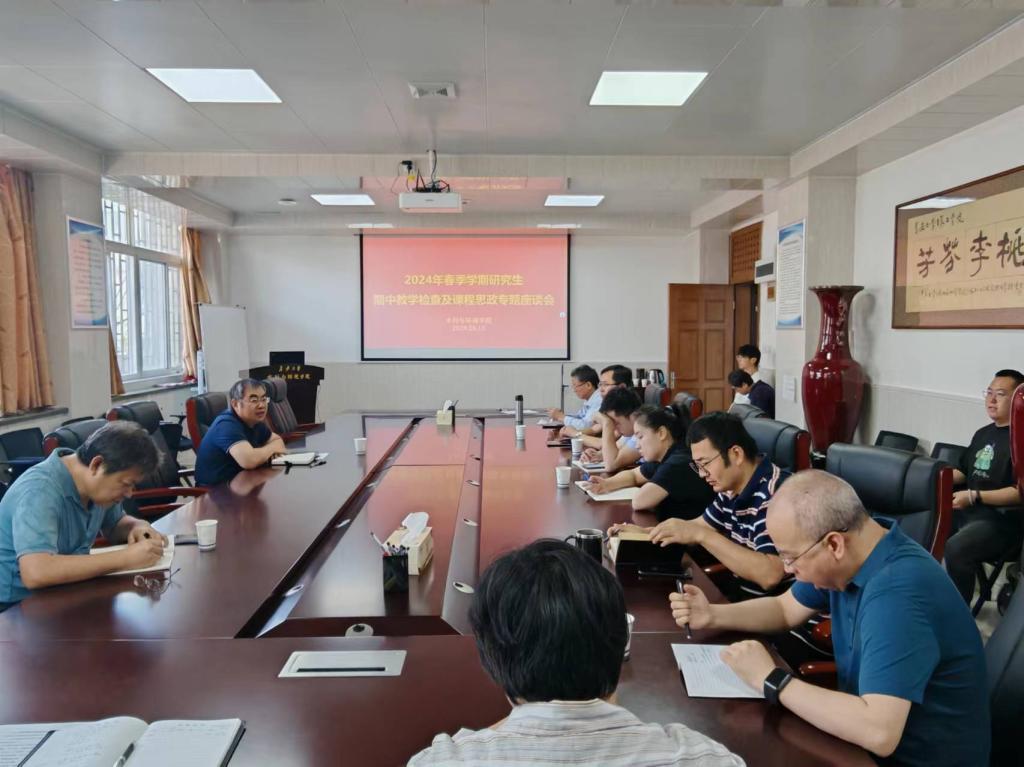 在学院三楼会议室召开2024年春季学期研究生期中教学检查及课程思政专题座谈会。学院领导、教学督导、教务员及教师代表和学生代表参加,副院长段磊主持会议。