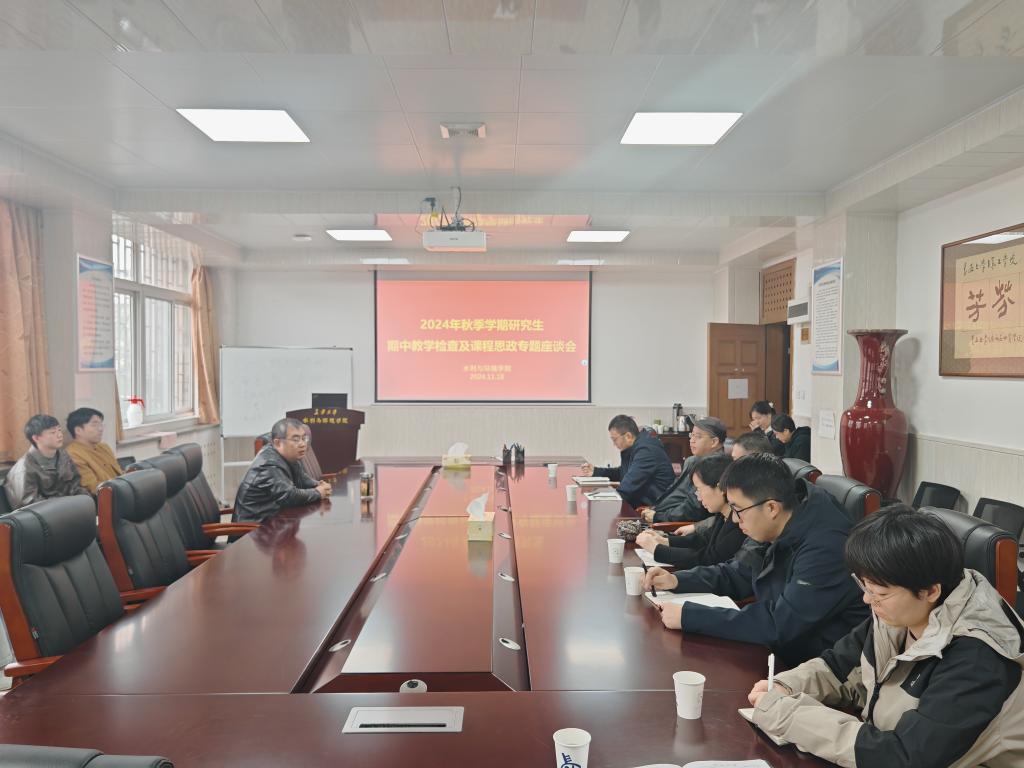 在学院三楼会议室召开2024年秋季学期研究生期中教学检查及课程思政专题座谈会。学院领导、系主任、教师代表和学生代表参加,副院长段磊主持会议。