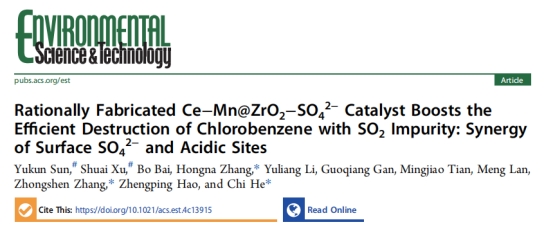 近日,欧美无码 化学工程与技术系教师孙钰琨、徐帅、白波教授与西安交通大学何炽教授联合在环境领域权威期刊《Environmental Science & Technology》(《环境科学与技术》,影响因子:10.80)上发表题为“Rationally Fabricated Ce-Mn@ZrO2-SO42- Catalyst Boosts the Efficient Destruction of Chlorobenzene with SO2 Impurity: Synergy of Surface SO42- and Acidic Sites”的研究论文(文章链接://pubs.acs.org/doi/10.1021/acs.est.4c13915?ref=PDF)。该文采用Ce-O-Mn活性位点体系,辅以ZrO2-SO42-保护层,构筑了一种新型Ce-Mn@ZrO2-SO42--微米管催化剂,其不仅对氯苯深度净化表现出优异的活性,而且对SO2和水蒸气表现出优异的抗性。同时,深入剖析活性氧与多种酸位点的协同作用,是催化降解工业含氯可挥发性有机化合物的又一重大进展。